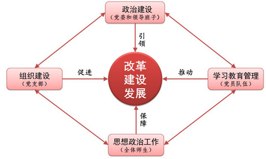 按照党的十九大提出的“全面推进党的政治建设、思想建设、组织建设、作风建设、纪律建设,把制度建设贯穿其中,深入推进反腐败斗争”党的建设总布局要求,学院党委充分吸收马克思主义哲学中系统论思想,结合学院党建工作实际,提出了“以党的政治建设为统领,以平台构建为切入点,以思想、组织、作风、纪律、制度建设为保障,以系统协同推进为工作路径,以推动党建工作内涵式发展和学院各项事业持续进步为总目标”党建体系构建思路,初步构建了“五位一体”党建工作体系。该体系由三个层次构成,顶层为全面提升党建工作质量这一总目标,中间层包含了党的政治建设、思想建设、组织建设、制度建设、作风建设、纪律建设六大任务,底层由平台机制建设、制度规范建设、方案模板制定、活动载体创建、作风建设五大模块组成,各个模块相互关联,各层次彼此支撑,从而形成了一个科学完备系统的工作体系。