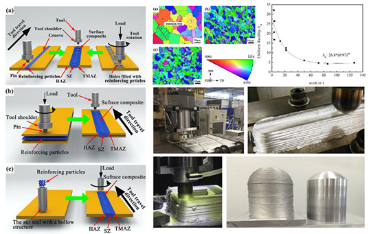 论文介绍了搅拌摩擦加工基本原理和技术优势,综述了搅拌摩擦加工在铸态镁合金微观结构改性、超塑性成型、细晶镁合金、表面复合材料制备和增材制造等方面的最新研究进展。研究成果如下:(1)搅拌摩擦加工技术联合时效工艺改性处理可显著细化组织,提高铸态镁合金综合力学性能。(2)搅拌摩擦加工技术可制备细晶、超细晶甚至纳米晶镁合金,强度大幅提高,塑性提高效果欠佳。为此,团队建立了镁合金加工硬化性能与均匀延伸率的定量关系,对于描述镁合金的均匀延伸率提供了一种有效方法。(3)搅拌摩擦加工改性镁合金具有较低位错密度和较高比例大角度晶界,有助于超塑性变形。对于镁合金,织构对超塑性变形行为的作用机制仍然存在争议。团队研究表明,织构会导致超塑性变形过程中启动柱面和锥面滑移,有利于超塑性变形。(4)搅拌摩擦加工技术可制备镁基表面复合材料,显著提高镁合金的表面性能。(5)搅拌摩擦增材制造是利用粉末或棒材原料在轴向进给压力的作用下通过中空结构搅拌头与基板接触,在搅拌头轴肩旋转作用下与基板产生摩擦热,软化金属,逐层沉积,实现三维增材制造。该技术制备的镁合金增材体残余变形小,微观组织细化、均匀化和致密化,具有优良的综合力学性能。