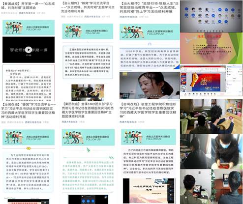 积极利用“蜂窝”学习交流平台和“思想引领·筑基人生”日常思想政治教育平台先后开展了 “众志成城,共克时艰”网络主题班会、学习《习近平总书记给在首钢医院实习的西藏大学医学院学生的回信》、全国大学生同上一堂疫情防控思政大课、防疫知识与法纪意识、“敬畏·感恩·责任”主题教育等80余次学习交流活动,守牢网络思想政治教育主阵地。通过观看防疫宣传片、学习疫情防控知识、抗疫一线先进事迹、个人学习感悟分享、对标楷模自我剖析等方式,进一步强化学生政治意识和责任担当精神,为夺取抗疫全面胜利筑牢思想根基。