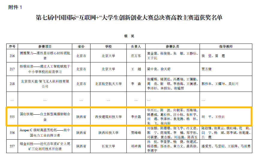 第七届中国国际“互联网+”大学生创新创业大赛总决赛高教主赛道获奖名单