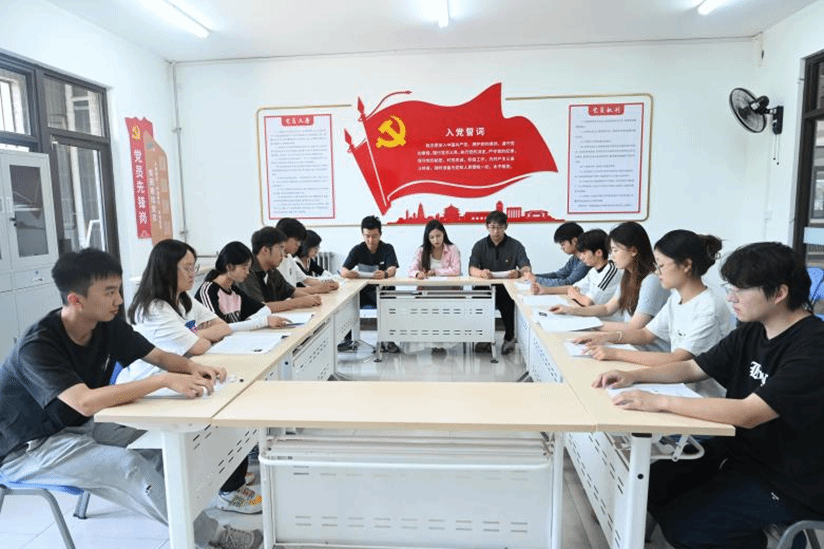 本科生一二年级党支部在紫阁一栋“一站式”学生社区党员工作站隆重召开党员大会暨新党员入党宣誓仪式。支部全体党员及拟接收为预备党员的发展对象参加会议,会议由党支部书记董甜子同志主持。