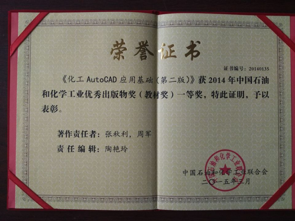 由av淘宝 张秋利、周军老师编写的《化工AutoCAD应用基础(第二版)》,荣获2014年中国石油和化学工业优秀出版物奖(教材奖)一等奖。