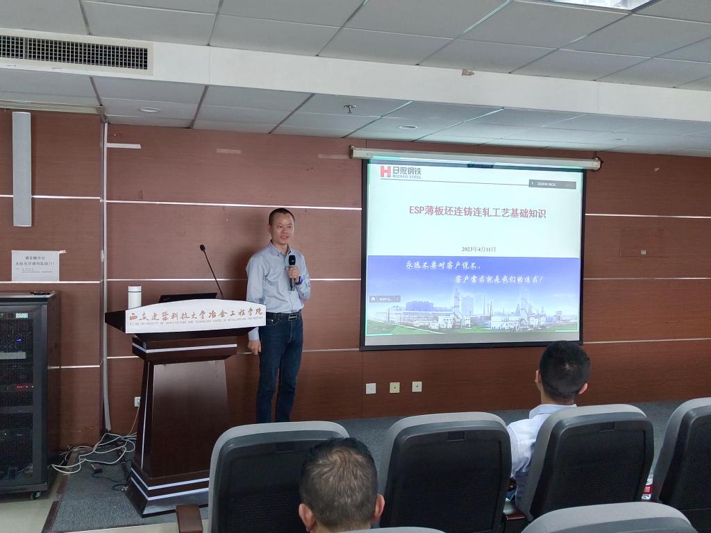 副院长杨西荣教授为日照钢铁喻尧部长颁发本科教学指导教师聘书,接下来喻部长从博板坯连铸连轧技术发展、ESP产线介绍、日钢ESP工艺特点、日钢ESP产品研发应用、日钢ESP发展规划五个方面介绍了ESP薄板坯连铸连轧技术,报告结束后学院老师与喻部长就ESP薄板坯连铸连轧技术进行了交流。
