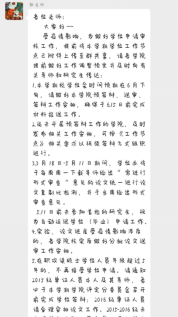 疫情当前,千万名医护人员和各行业工作人员奋战在一线抗击疫情,护卫我们和家人的安全。党晓娥老师对学生提出寄语:首先我们一定要感谢所有付出努力的人们!要知道,我们目前虽有些沉闷但平安的生活,是他们用生命的代价换来的!二是要严格服从学校和所在地的防疫要求。在未接到学校正式通知前,做到不离家、不返校。在家遵守当地的规定,做好自身和家人身体健康监测,按要求每日报告健康状况和相关动态。三是要抓紧时间认真学习。保证小组的研究进度不变、内容和要求不打折扣!在家期间必须按原计划开展研究工作并保证质量,每周必须提交周报,有问题随时与老师沟通。
