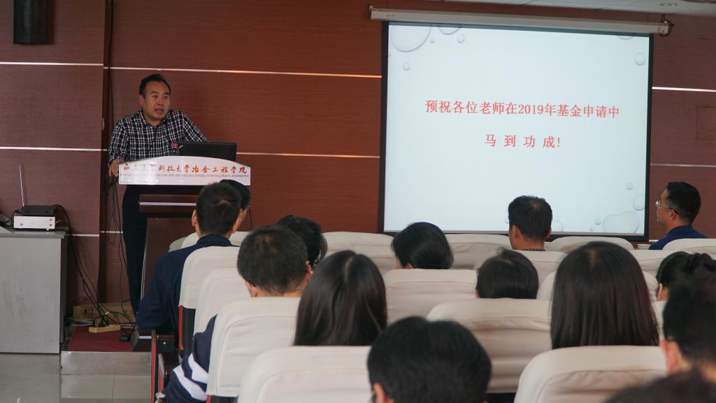 李林波院长作2019年国家自然科学基金申报动员。李院长先分析了近两年我院及各学院在国家自然科学基金申报及获准情况,肯定各位老师的成绩;接着分析了近十年工程与材料科学部国家自然科学基金面上和青年项目资助情况,最后将2019年国基金申报工作的安排、要求以及我院可申报人数做了详细的说明,要求每位老师积极申报,预祝老师能马到功成。