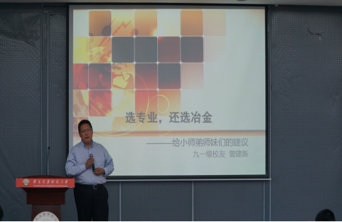 随后,我院91级杰出校友曾建新学长向大家做励志成才报告。他结合自身多年国际市场打拼的经验,以开阔的视野和格局分析讲解了冶金工程未来发展道路上的前景,希望同学们能坚守自己所爱,学到一身理工科专业的硬功夫。学长用诙谐幽默的语言,传达给大家许多值得深刻思考的道理,赢得现场观众的热烈掌声。