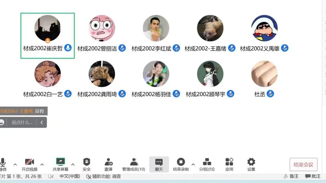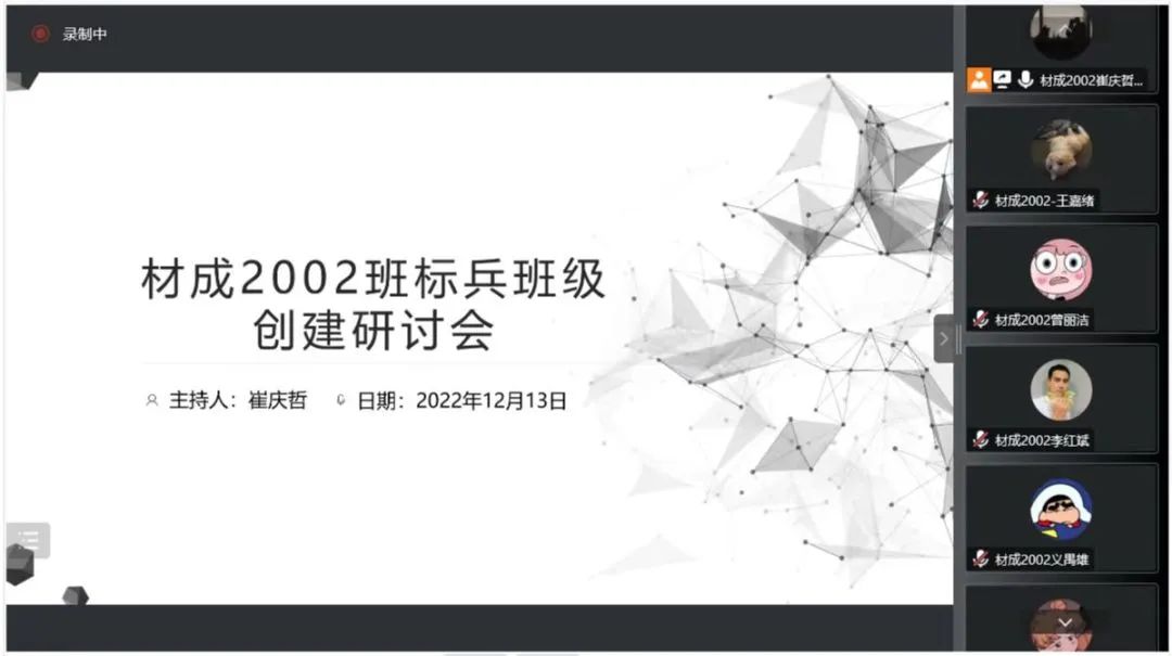 材成2002班标兵班级创建研讨会于2022年12月13日16:00以线上会议的方式成功开展。本次研讨会由材成2002班团支书崔庆哲主持,av淘宝