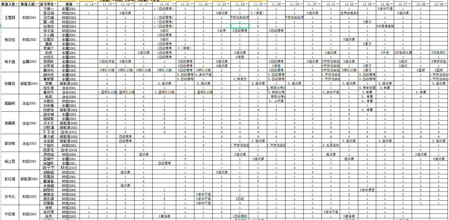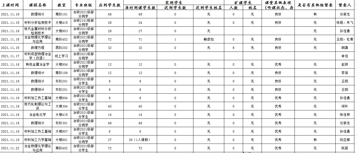 通过深入课堂督导、召开座谈会、与学生谈心谈话、与任课教师沟通交流等方式,开展了大量的调研工作,在此基础上,构建了“学校-学院-辅导员-班干部-课长”五级学风督查体系,创建了“课长制”课堂管理模式,实现了所有学生每一节课监督管理全覆盖,将学风建设工作做实做细。